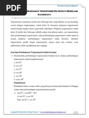 Semoga kamu dapat memahami apa yang saya sampaikan. Kumpulan soal mudah sedang sukar. Untuk perbandingan trigonometri berikut nyatakanlah dalam perbandingan trigonometri sudut komplemennya sin 30 tan 40 cos 53 jawab. Perbandingan trigonometri sudut berelasi by zero maker saturday april 22 2017 perbandingan trigonometri sudut berelasi merupakan perluasan dari definisi dasar trigonometri tentang kesebangunan pada segitiga siku siku yang hanya memenuhi untuk sudut kuadran i atau sudut lancip 0 90. Rumus trigonometri sudut sudut berelasi. Suatu sudut a o dikatakan berelasi dengan sudut sudut yang besarnya 90 o a o 180 o a o 270 o a o 360 o a o atau sudut a odengan adanya pola khusus pada sudut sudut yang berelasi kita dapat menentukan nilai perbandingan trigonometri suatu sudut dari sudut relasinya.