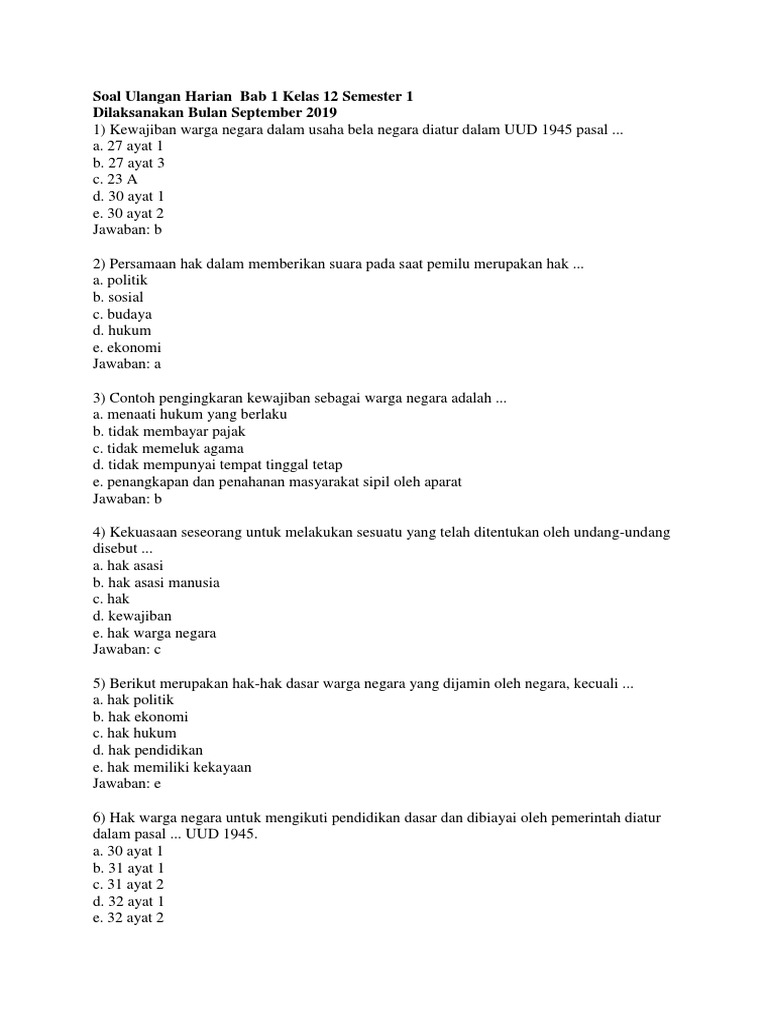 Sekolahmuonline contoh soal ppkn pilihan ganda dan jawabannya bab 1 harmonisasi hak dan kewajiban asasi manusia dalam perspektif pancasila ppkn kelas xi smasmkma. Pengertian ciri prinsip jenisnya. Orang lain 4 melakukan penyuluhan tentang hak warga negara. Keterangan soal jumlah soal pilihan ganda 25 jumlah soal isian singkat 15 jumlah soal uraian. Sebutkan contoh kewajiban warga negara. Contoh soal pkn kelas 9 semester 1 dan 2 revisi contoh soal pkn kelas 9.