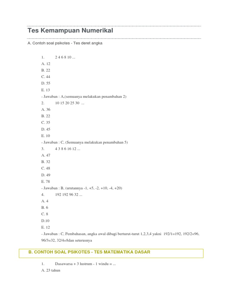 11 contoh soal psikotes sinonim persamaan kata 12 contoh soal psikotes antonim lawan kata 13 contoh soal psikotes analogi verbal kolerasi makna 14 contoh soal psikotes kemampuan penalaran. Tes psikotes online untuk persiapan ujian psikotes kerja. Download lengkap kumpulan contoh soal psikotes dan jawabannya lengkap terbaru doc dan pdf disini. Download contoh soal psikotes 2019 matematika gambar polri bank karayawan deret angka pdf cpns sma online dan jawabannya beserta pembahasannya lengkap. Pada postingan ini admin sedikit merangkum dari hasil file file yang sudah. Latihan psikotes online untuk ujian psikotes kerja contoh soal tes psikometri tes iq logika matematika psikotes numerik abstrak deret angka psikotes aritmatika matrik gambar tes kemampuan spasial psikotes kraepelin pauli tes psikotes baum tree draw a person dap psikotes house tree person test htp.