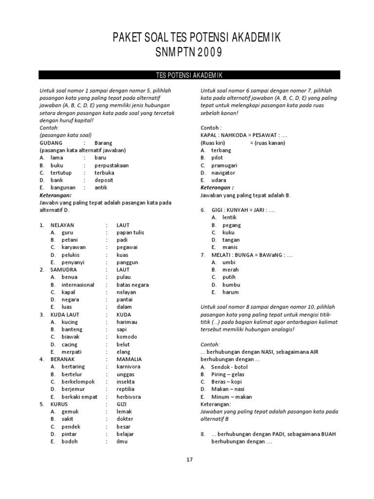 Contoh soal tes verbal potensi akademik dan kunci jawaban pada kesempatan kali ini saya akan memberikan kumpulan contoh soal lengkap untuk tes potensi akademik tpa dengan tema soal tes verbal yang berjumlah 114 soal yang lengkap dengan kunci jawabannya. Bagi sebagian orang tes potensi akademik dianggap sebagai hantu yang menakutkan karena dianggap tes yang paling sulit dalam suatu ujian. Latihan soal tes potensi akademik tpa kode soal.