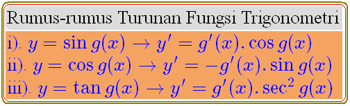 Fungsi trigonometri yang biasa digunakan yaitu sin x cos x dan tan x. Pada tutorial sebelumnya kita telah mempelajari tentang turunan fungsi aljabar maka dalam kesempatan ini dilanjutkan dengan turunan trigonometri.