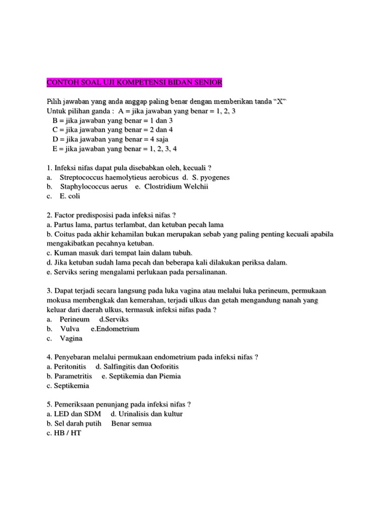 Contoh soal untuk uji kompetensi bidan 1 unknown. Guru sd smp sma contoh soal uji kompetensi bidan indonesia. Dari pemeriksaan vt oleh bidan di jumpai adanya masa uterus dapat dan berbenjol benjol. Kasus untuk soal no. Haidselama 3 minggu saat ini merasa mual muntah dipagi hari. J berumur 32 tahun datang ke klinik untuk memeriksakan kehamilannya.