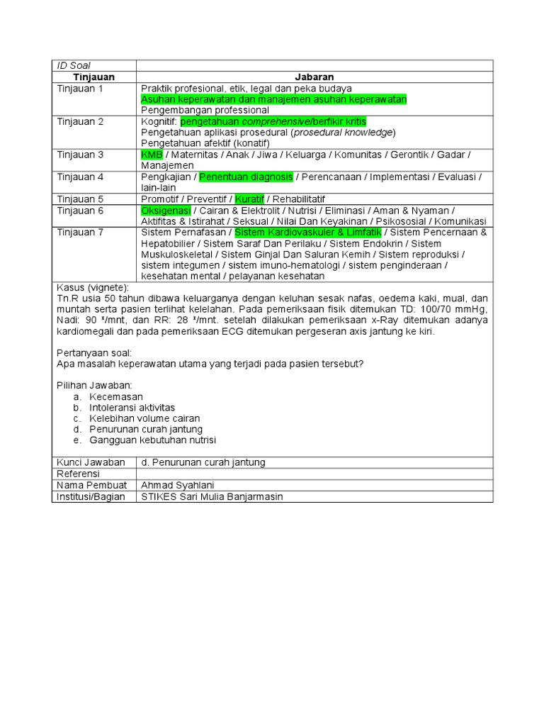 Klien mengatakan pada perawat bahwa ia akan memilih obat herbal untuk membantu menurunkan tekanan darahnya. Dibawah ini merupakan soal uji kompetensi keperawatan medikal bedah kmb disertai kunci jawaban 1. Seorang pasien perempuan berumur 62 tahun dirawat di ruang interna. Contoh soal uji kompetensi perawat edited by muhammad imronskepns berikut ini saya menyajikan contoh kisi kisi soal uji kompetensi keperawatan stage keperawatan medikal bedah yang bersumber dari regional kalimantan tahun 2015 hanya sekedar berbagi dan hanya untuk pembelajaran. Pasien masuk rumah sakit dengan riwayat telah menderita diabetes melitus selama 6 tahun terakhir dan terdapat luka pada telapak kaki kanan. Contoh soal uji kompetensi keperawatan medikal bedah kmb edisi 1 nursing professional hai sobat semuanya bertemu lagi dengan kami kali ini kami akan membagikan contoh soal uji kompetensi ukom keperawatan kmb beserta kunci jawabannya dibawah ini.