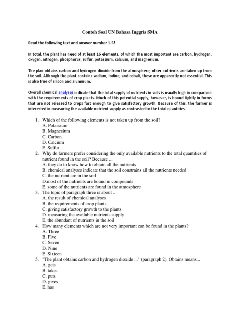 Contoh soal un bahasa inggris sma. 45 contoh soal ini kami sajikan untuk adik adikku yang sedang ingin belajar bahasa inggris untuk modal belajar dirumah karena lengkap dengan kunci jawaban dan pembahasannya. Pelajari materi latihan soal dan pembahasan soal un sma bahasa inggris. Disekolahmu pasti sudah dimulai kegiatan bimbingan belajar untuk mendalami materi un sma 2020. Prediksi soal un sma. In total the plant has need of at least 16 elements of which the most important are carbon hydrogen oxygen nitrogen phosphorus sulfur potassium calcium and magnesium. Mudah mudahan bisa digunakan untuk sekedar memberikan persiapan berlatih mempelajari soal un unbk unkp bahasa inggris sma tahun 2020 sma ipa sma ips dan sma bahasa ala games.