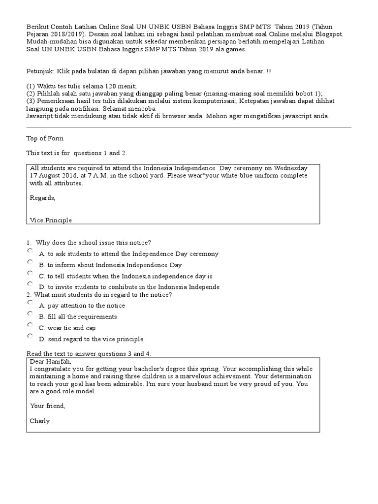 Contoh soal usbn bahasa indonesia. Desain soal latihan ini sebagai hasil pelatihan membuat soal online melalui blogspot. Bacalah setiap soal dengan teliti dan. Pendidikan bahasa indonesia itu pendidikan bahasa indonesia adalah salah satu pelajaran yang dapat di praktekan dalam kehidupan sehari hari karena hal ini sangat bermanfaat untuk pergaulan maka kami akan memberikan soal bahasa indonesia kelas 9 tingkat smp mts. Mata pelajaran yang akan kita bahas adalah mata pelajaran matematik bahasa indonesia dan ilmu pengetahuan alam ipa. Usbn smp terdiri dari 10 mata pelajaran yang terdiri dari matematika bahasa indonesia bahasa inggris pendidikan agama islam ilmu pengetahuan alam ipa ilmu pengetahuan sosial ips tik pjok prakarya seni budaya dll. Mudah mudahan bisa digunakan untuk sekedar memberikan persiapan berlatih mempelajari latihan soal un unbk usbn bahasa indonesia smp mts tahun 2020 ala games.