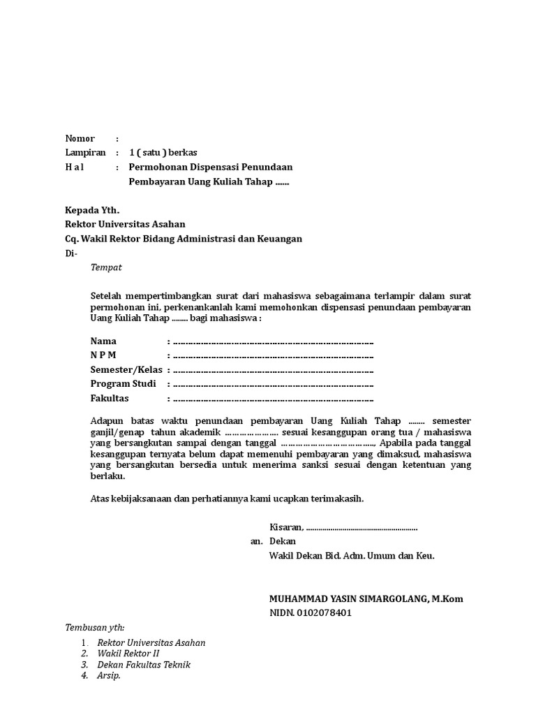 Di bawah ini adalah contoh surat dispensasi kuliah untuk keterlambatan pembayaran spp yang biasa dipergunakan. 15 contoh surat dispensasi resmi untuk berbagai tujuan berbicara mengenai dispensasi tentu akan sangat erat kaitannya dengan tanggung jawab ataupun tugas utama kita.