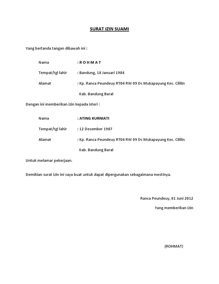 Contoh surat izin suami. Tempat tanggal lahir. 2232017 10057 pm. Contoh surat pengunduran diri spd resign. Contoh lampiran surat izin kerja dari suami ketika kita ingin melamar pekerjaan tentu harus mengetahui kelengkapan syarat yang harus disiapkan untuk diajukandiserahkan ke perusahaan pt yang kita kehendaki dimana kita ingin bekerja. Surat izin suami mungkin dah terlambat untuk cn berkongsi dengan rakan rakan guru yang memohon pertukaran guru 2014 bulan september. Makalah ekonomi kelas x.