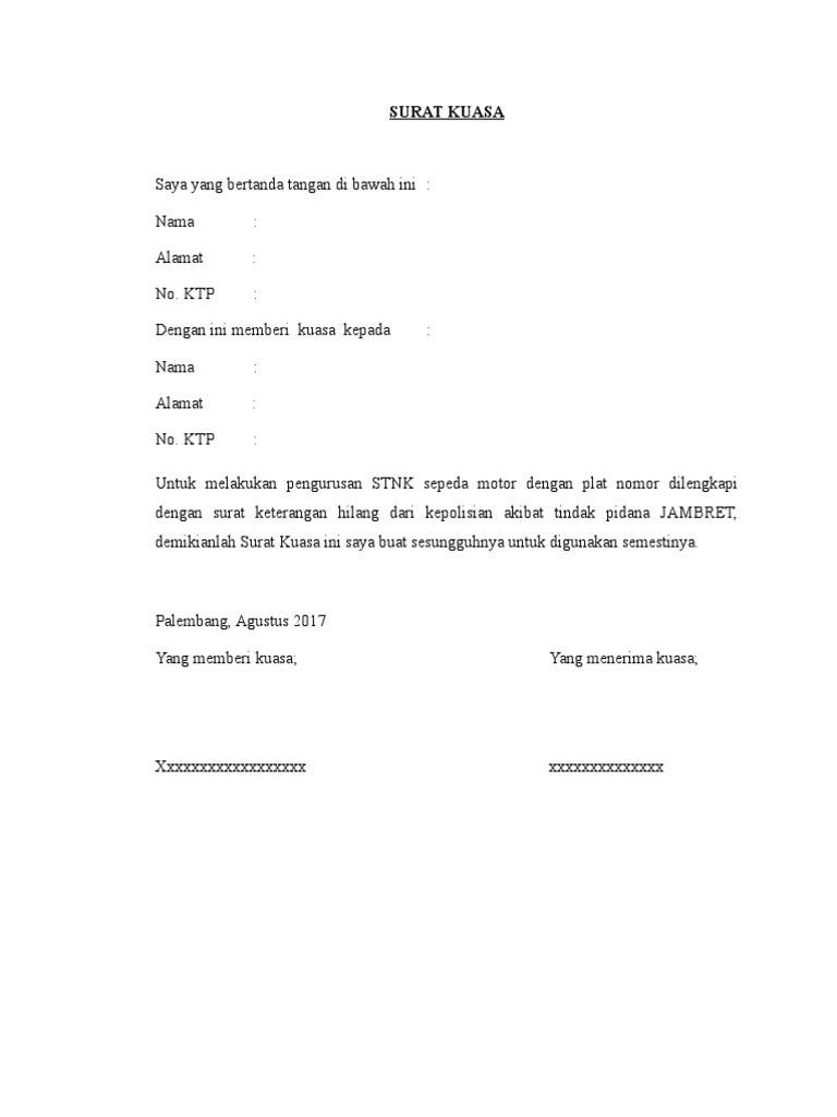 Surat adalah bentuk komunikasi tertulis yang dibuat oleh komunikator kepada komunikan dalam bentuk kertas dan di dalamnya ada informasi penting. Surat kuasa adalah surat yang berisi pelimpahan wewenang dari seseorang atau pejabat tertentu kepada seseorang atau pejabat lain. Memang surat ini dibuat untuk memberikan pernyataan dan kekuasan penuh oleh penulis kepada penerima. Bila anda ingin mendownload contoh surat kuasa dalam format doc silahkan langusng klik yang telah tersedia dibawah ini. Contoh surat kuasa pengambilan bpkb doc 3. Contoh surat kuasa perwakilan.
