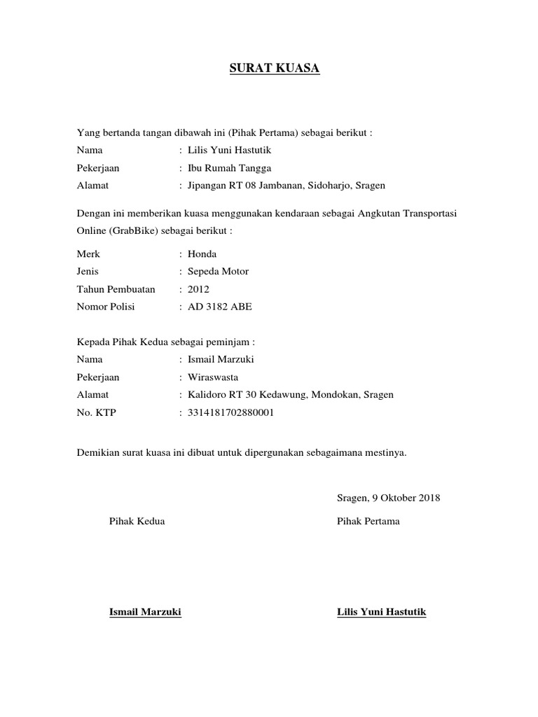 Contoh Surat Kuasa Motor Grab