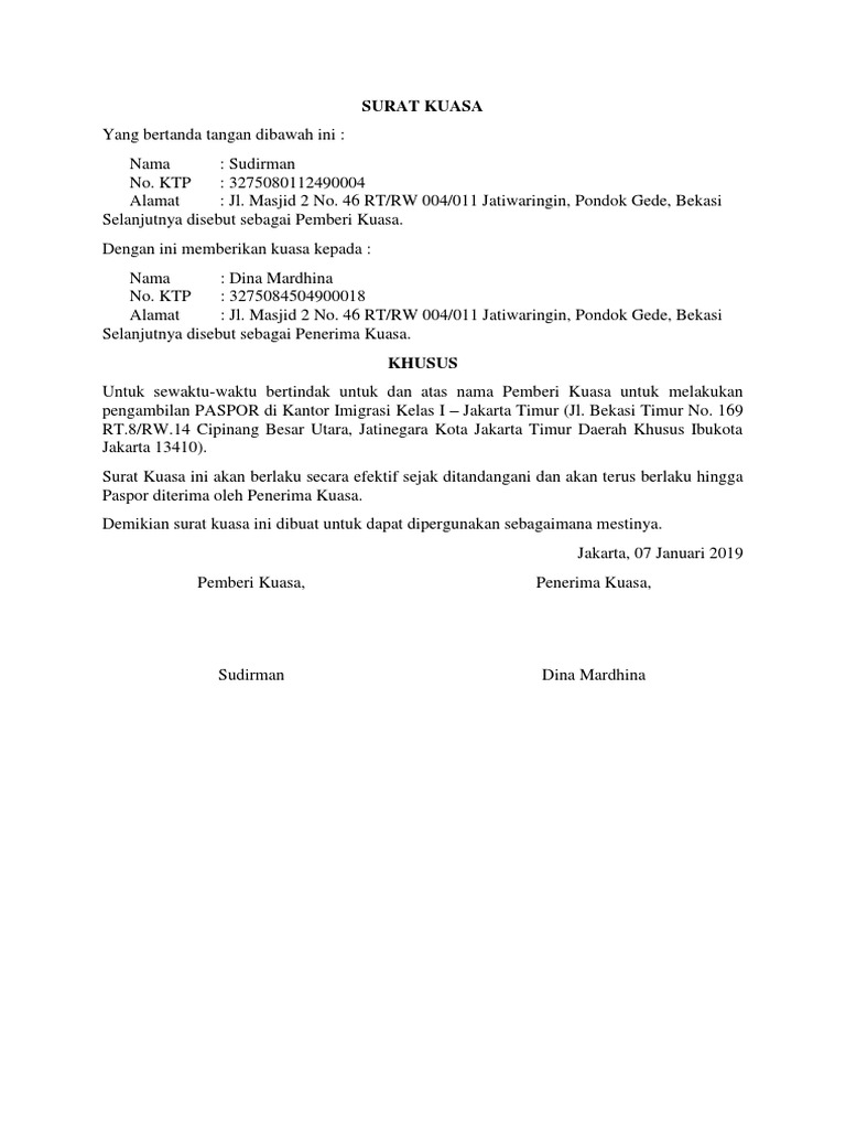 Surat kuasa harus ditempel materai 6000 sebagai simbol resmi pemberian kuasa pada pihak kedua. Dengan adanya surat kuasa ini pihak imigrasi akan percaya bahwa orang yang mengambil paspor kita memang benar benar suruhan kita. Contoh surat kuasa pengambilan sebelum membahas contoh surat kuasa sobat udah tahu belum apa itu surat kuasa. Dan saat membubuhi tanda tangan tanda tangan masing masing pihak harus mengenai materai 6000. Lampung june 6 2015. Karena pihak imigrasi tidak akan menyerahkan paspor kita orang lain maka hal ini yang melatar belakangi pembuatan surat kuasa pengambilan paspor ini.
