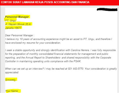 Contoh surat lamaran kerja dalam bahasa inggris untuk accounting dan artinya. Tujuannya tentu adalah anda ingin mendapatkan kesempatan untuk mengikuti seleksi yang di adakan oleh perusahaan atau instansi tempat anda melamar. Hal terpenting yang harus diperhatikan pada saat membuat surat lamaran kerja berbahasa inggris adalah bahasa yang formal format yang benar dan tata cara penulisan yang baku baik dan benar. Apakah kamu sedang mencari contoh surat lamaran kerja bahasa inggris cover letter misalnya karena ingin melamar kerja ke perusahaan multinasionalmeskipun proses mencari pekerjaan sudah terjadi sejak lama namun tak banyak orang yang dapat membuat surat lamaran pekerjaan yang baikhal ini karena kurangnya pembekalan bagi mahasiswa dalam hal persiapan untuk melamar pekerjaan ke sebuah. Mengenai surat lamaran kerja hal yang menjadi catatan dan harus diperhatikan adalah. Contoh surat lamaran kerja dalam bahasa inggris untuk sekretaris dan artinya. Sistematis terdapat bagian bagian surat yang terdiri dari nama divisi dan alamat tujuan pembuka surat isi surat penutup surat.
