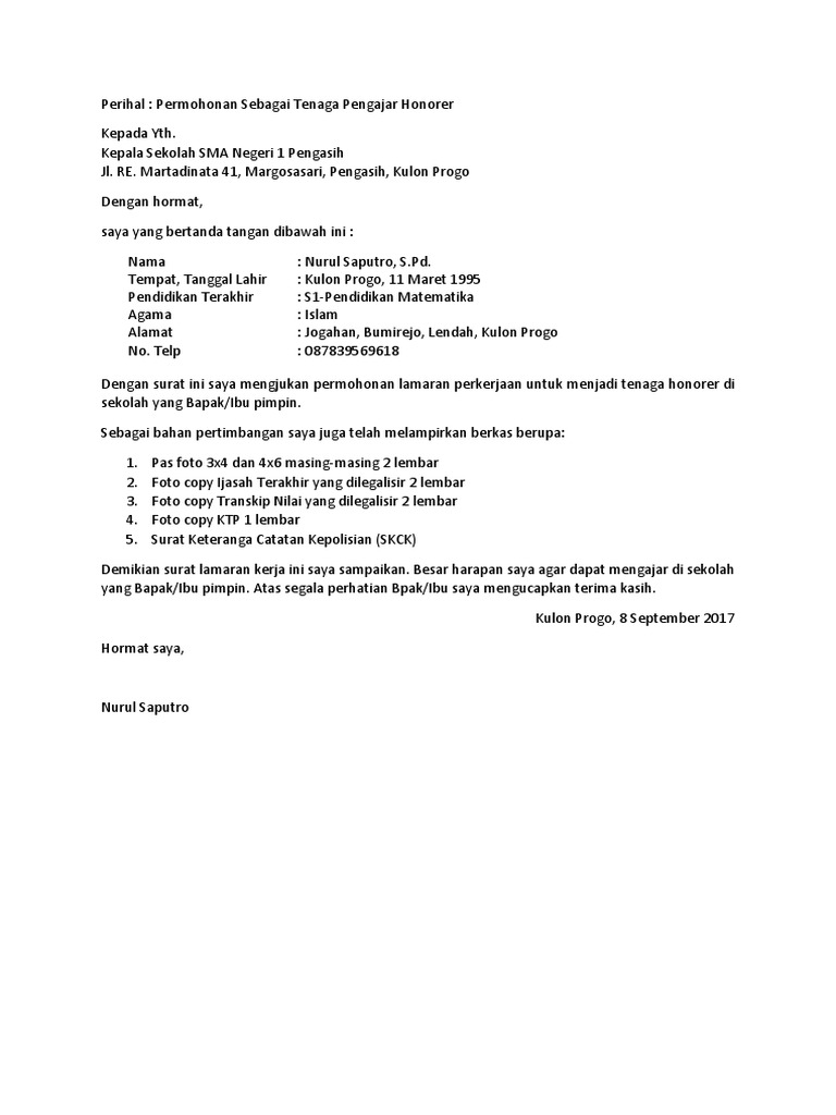 Contoh surat lamaran kerja guru doc. Namun anda tidak perlu merangkai kosakata lagi karena ada beberapa contoh surat lamaran yang dapat anda gunakan tinggal mengganti beberapa poin yang sesuai dengan latar belakang anda. Maka dari itu pada kesempatan kali ini saya akan membagikan beberapa contoh surat lamaran kerja format doc yang baik dan benar untuk anda. Itu tadi merupakan contoh surat lamaran kerja yang bisa anda gunakan untuk membuat surat lamaran kerja dengan cara tulis tangan maupun dengan ketik komputer. Namun kesulitan mencari pekerjaan sekarang ini seringkali menjadi momok yang menakutkan bagi banyak orang. Yuk simak selengkapnya di bawah ini. Contoh surat lamaran kerja untuk menjadi guru sma ini portal uang bagi bedasarkan informasi lowongan kerja yang telah didapat.