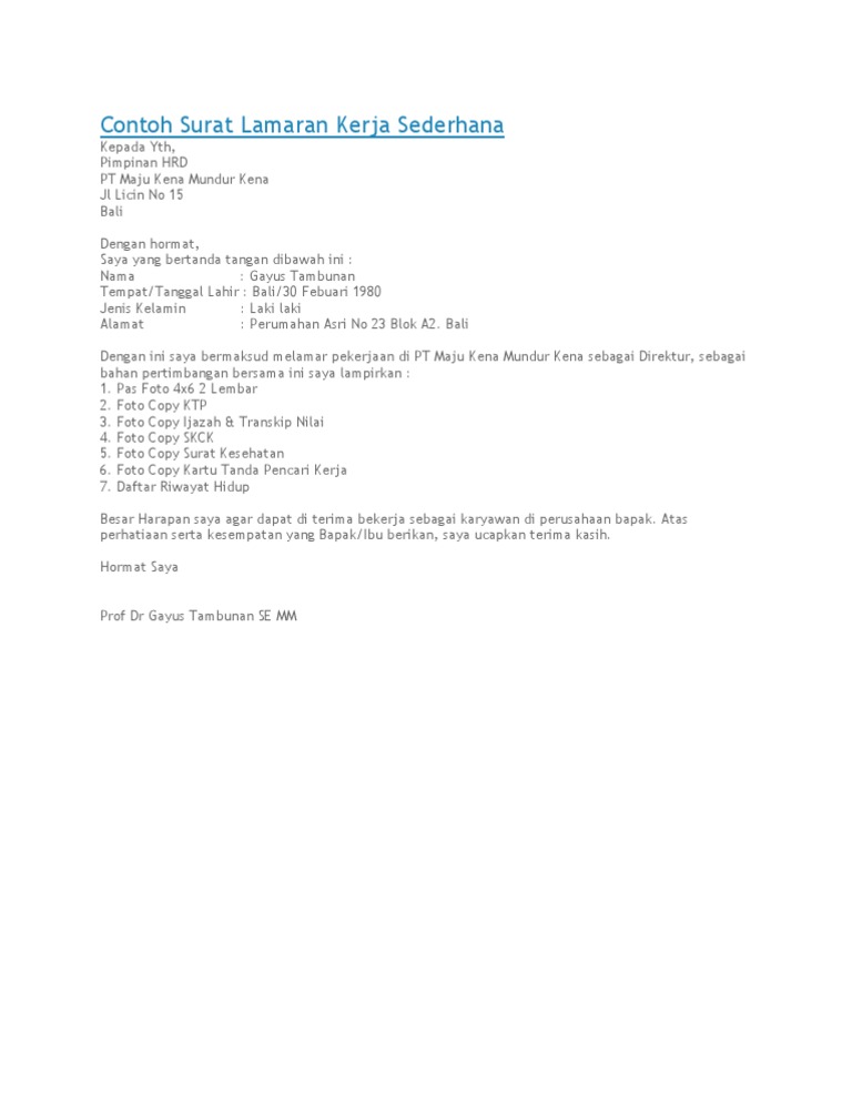 Contoh surat lamaran sederhana. Mungkin terdapat jutaan artikel di internet yang menyediakan panduan bagaimana cara membuat surat lamaran pekerjaan yang disertai contoh surat lamaran pekerjaan baik itu surat lamaran kerja untuk melamar ke perusahaan maupun surat lamaran pekerjaan. Contoh pertama yaitu contoh surat lamaran pekerjaan sederhana untuk bekerja di pt yang baik dan benar sesuai dengan puebi. Contoh surat lamaran kerja pada artikel ini kita akan membahas contoh surat lamaran pekerjaan yang dapat kamu dapatkan beserta file doc nya. Contoh surat lamaran kerja membuat surat lamaran kerja tidak boleh asal dalam membuatnya membutuhkan acuan sebagai referensi contoh surat lamaran kerja ini adalah salah satu bahan yang bisa dijadikan acuan dalam membuat surat lamaran pekerjaan. Laporan arus kas berfungsi untuk menampilkan terjadinya transaksi kas keluar dan kas masuk selama periode akuntansi. Surat lamaran kerja benar benar merupakan hal kebutuhan utama bagi kita para pencari kerja untuk mendapatkan pekerjaan yang layak apakah dari kita yang baru saja wisuda kuliah pindah kerja dari perusahaan lain mencari suasana yang baru ataupun.
