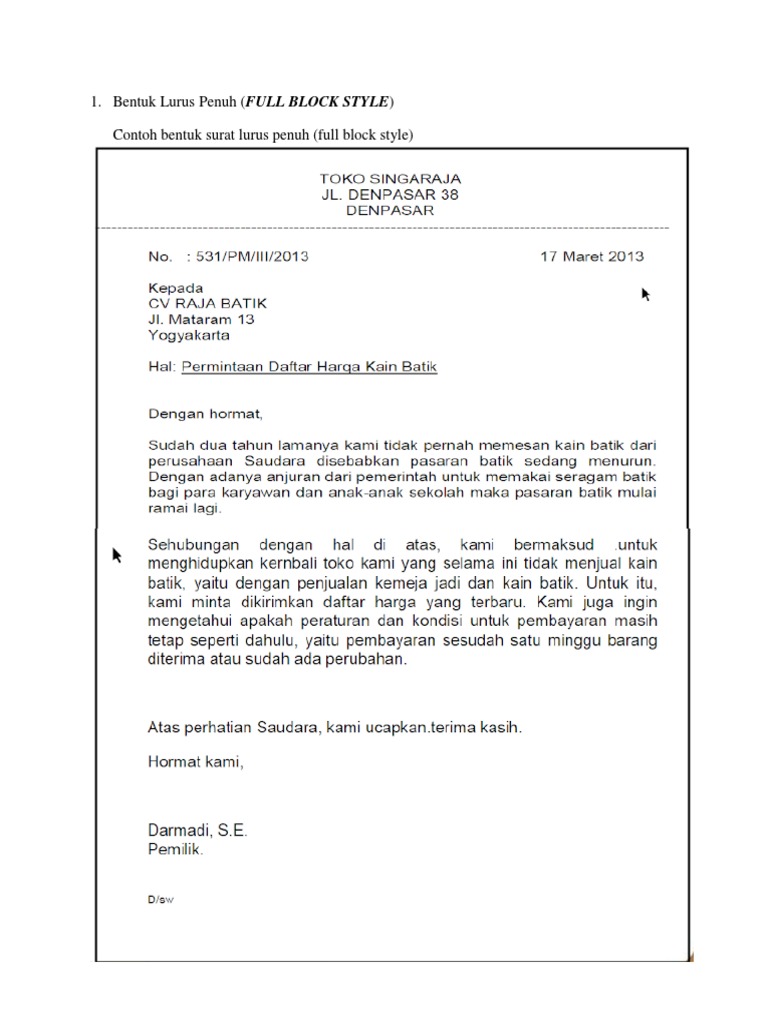 Bentuk bentuk surat yang dapat digunakan adalah bentuk lurus penuh full block style bentuk lurus block style bentuk setengah lurus semi block style bentuk lekuk indented style bentuk menggantung hanging paragraph style bentuk resmi official style. Lurus penuh full block style bentuk surat lurus penuh adalah yang paling mudah dilakukan karena bentuk surat ini pengetikanpenulisannya dari awal sampai akhir dimulai dari rata sisi kiri. Untuk lebih jelasnya perhatikan contoh soal dan jawaban surat bentuk lurus penuh full block style berikut ini. Ukuran batas pinggir kiri 20 dan kanan 80 elite atau batas pinggir 15 dan kanan 75 pica. Bentuk surat yang paling umum digunakan salah satunya adalah bentuk full block style atau bisa juga disebut bentuk lurus penuh. 015jsv09 26 april 2011 pt damai abadi jlgunung sari no20 ja.
