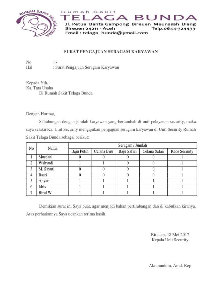 Contoh surat pengajuan seragam untuk karyawan. 15 contoh surat pengajuan dengan penulisan yang baik dan benar jika diartikan secara sederhana maka surat pengajuan merupakan sebuah jenis surat yang digunakan untuk mengajukan permohonan atau permintaan kepada pihak lain. Contoh surat penawaran dan proposal pengadaan seragam sekolah merupakan salah satu dari beberapa jenis alat komunikasi resmi yang berkhasiat untuk menunjukkan produk terkhusus seragam sekolah. Surat penawaran harga pakaian seragam karyawan ti rsu kambang jambi tahun 2016 2017. Jika anda memiliki sebuah perjuangan konveksi atau jahitan tentu ingin mendapatkan order maksimal diantaranya yakni pada ketika menjelang kenaikan kelas. Karenanya perusahaan akan membuat surat pemberitahuan kepada karyawan. Kerjasama biasanya sering dilakukan antar organisasi lembaga atau perusahaan.