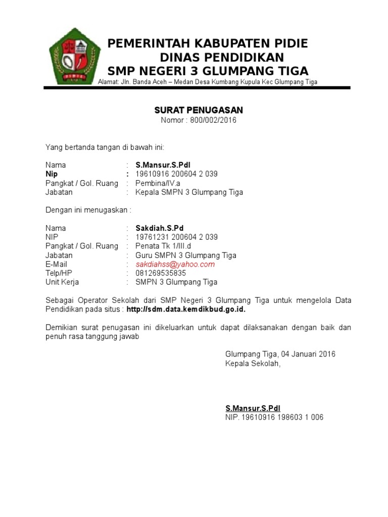 Contoh format file surat penugasan yang dilampirkan pdf size kurang dari 2 mega pixel. 15 contoh surat tugas resmi yang baik dan paling lengkap salah satu jenis surat yang sangat sering digunakan oleh perusahaan maupun instansi tertentu adalah surat tugas. Berikut ini contoh surat tugas yang strukturnya. Pada awalnya sekolah cukup menerbitkan satu surat penugasan operator sekolah menjadi contact person sekolah dalam rangka pengelolaan sistem dapodikdas sekolah melakukan pengumpulan perekaman pengelolaan dan pemeliharaan serta pemutakhiran data pada sistem dapodik sekolah secara valid optimal berkala dan berkesinambungan memberikan laporan atas perkembangan dan capaian kegiatan dan. Operator sekolah salah satu kebijakan yang harus ditetapkan oleh kepala sekolah dalam persiapan menyambut datangnya aplikasi dapodik versi 2017 yaitu menetapkan petugas sistem aplikasi pendataan dapodikdas dan dapodikmen dengan cara membuat sk surat keputusandengan adanya sk hal ini berarti para operator sekolah akan bekerja sesuai dengan tupoksi yang terdapat di sk. Yang membedakan surat tugas dengan surat resmi lainnya ada di bagian isi bahwa dalam surat tugas dinas harus ada identitas pemberi wewenang atau pejabat atasan identitas pegawai serta instansi yang dituju.