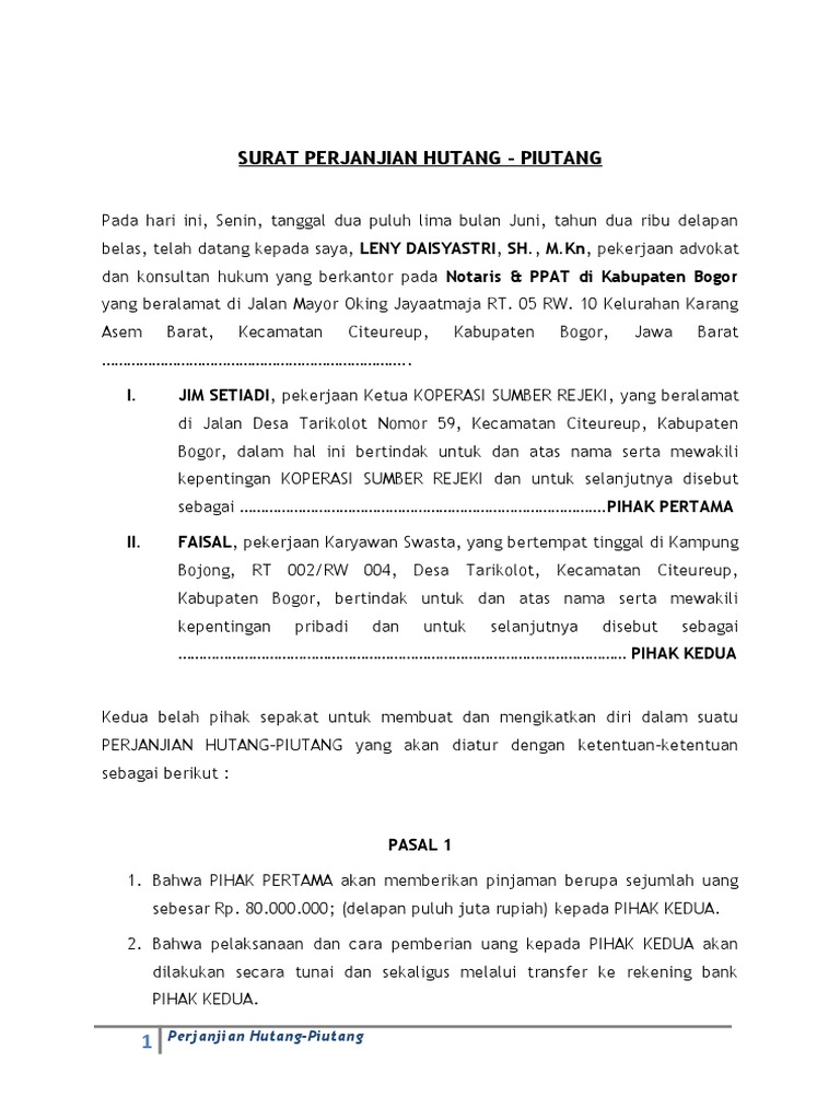 15 contoh surat perjanjian hutang yang benar dan terlengkap sebuah perjanjian merupakan kesepakatan yang dibuat oleh dua orang atau dua pihak mengenai sesuatu hal tertentu. 339 cibinong bogor dengan dihadiri oleh saksi saksi yang saya notaris kenal dan akan disebutkan pada bagian akhir akta ini.