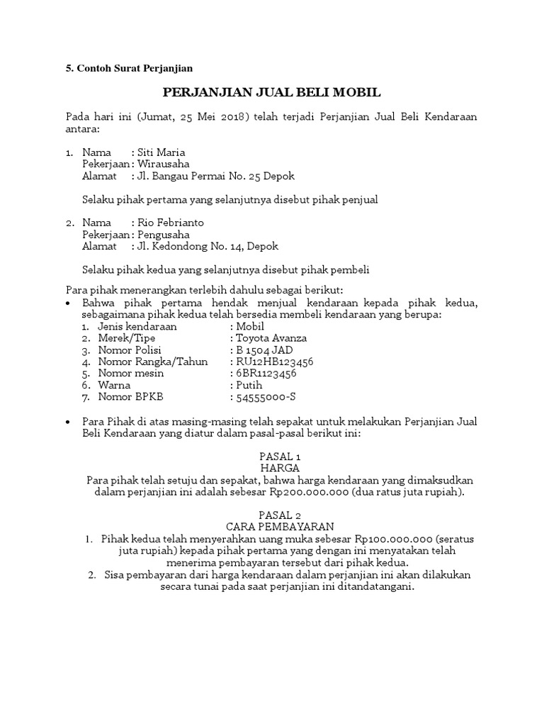 Pembayaran berikutnya akan dilakukan 1 satu. Contoh surat perjanjian jual beli vi. Anda bisa mengunduh download contoh surat perjanjian jual beli rumah versi lamudi dalam bentuk pdf dan doc di akhir artikel ini. Nah dari penjelasan di atas admin yakin anda sudah cukup tahu akan manfaat atau fungsi dari surat perjanjian jual beli mobil. Nama dan identitas pihak pertama dan kedua pencantuman nama dan identitas serta pemberian label pihak pertama dan pihak kedua menandakan adanya transaksi jual beli yang sah antar kedua belah pihak. Seratus juta rupiah yang harus sudah dibayar oleh pembeli secara tunai kepada penjual pada saat ditandatanganinya perjanjian ini.