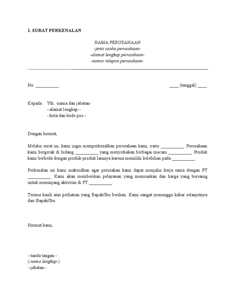 Contoh surat perkenalan perusahaan. Dengan surat perkenalan yang anda berikan tersebut maka akan banyak orang yang mengenal produk dan jasa anda sehingga kemungkinan mereka untuk membeli akan lebih besar. Contoh surat perkenalan seiring dengan kemajuan zaman dan kecanggihan teknologi sekarang ini pihak perusahaan memang sangat mudah untuk memperkenalkan perusahaan mereka maupun produk yang mereka miliki. Surat perkenalan adalah surat yang ditulis dengan tujuan memperkenalkan suatu perusahaan kepada perusahaan lembaga atau instansi lain tentang bidang yang geluti barang dan jasa apa saja yang di hasilkan dan lain lain yang menyankut perusahaan tersebut. Semoga dapat membantu perusahaan anda yang ingin melakukan perkenalan dengan perusahaan lain dengan cara membuat surat perkenalannya terlebih dahulu. Berikut contoh suratnya. Contoh contoh surat bisnis sangat beragam jumlahnya bisa meliputi surat perintah kerja surat perkenalan bisnis surat pemesanan produk surat pindah alamat kantor surat penagihan surat kontrak kerjasama surat perjanjian ataupun surat pengaduan.