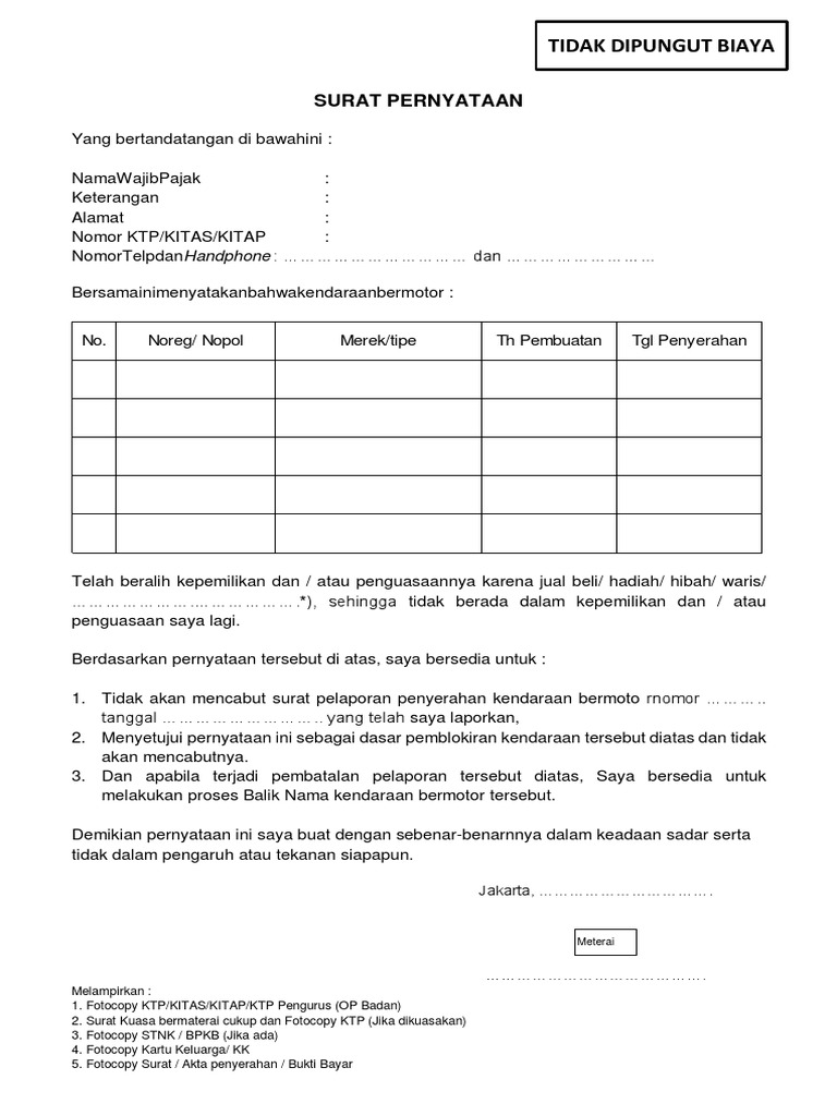 Menyetujui pernyataan ini sebagai dasar pemblokiran kendaraan tersebut diatas dan. Prosesnya juga tidak lama hari itu diblokir langsung tidak dikenai pajak progresif kata dia. Salah satu contoh form surat kuasa pengurusan stnk di samsat dapat dilihat sebagai berikut. Contoh surat pernyataan secara umum surat pernyataan merupakan jenis surat yang dibuat oleh individu yang menyatakan dirinya atau dibuat untuk orang lain yang pernah atau tidak pernah melakukan sesuatu. Persyaratan yang harus dibawa pemohon lanjut bayu cukup melampirkan kartu keluarga kk kartu tanda penduduk ktp serta mengisi formulir permohonan blokir kendaraan. Contoh surat pernyataan blokir stnk motor dan mobil saat anda akan melakukan blokir pajak motor atau mobil anda harus membuat surat pernyataan bahwa anda saat ini sudah bukan pemilik motormobil tersebut entah karena anda menjual kendaraan tersebut menghibahkanya atau karena kendaraan tersebut hilang.