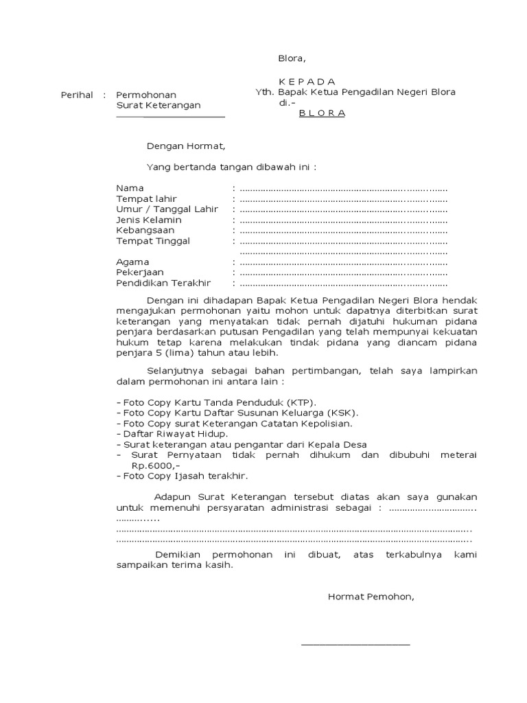 Demikian pernyataan ini saya buat dengan sesungguhnya untuk memenuhi persyaratan dalam rangka mendaftarkan diri mengikuti seleksi terbuka pengisian jabatan pimpinan. Tulis nama lengkap sesuai ktp nik. Contoh surat pernyataan tidak pernah di pidana atau tidak sedang menjalani hukuman pidana oleh bangdidav 04 sep 2018 posting komentar surat keterangan tidak pernah dipidana yang dikeluarkan oleh pengadilan negeri merupakan salah satu persyaratan yang harus dipenuhi bagi kamu yang ingin mencalonkan diri sebagai caleg lurah camat hingga gubernur. Tulis alamat lengkap sesuai ktp dengan ini menyatakan yang sebenarnya bahwa saya tidak pernah dijatuhi hukuman atau tidak sedang menjalani penjara.