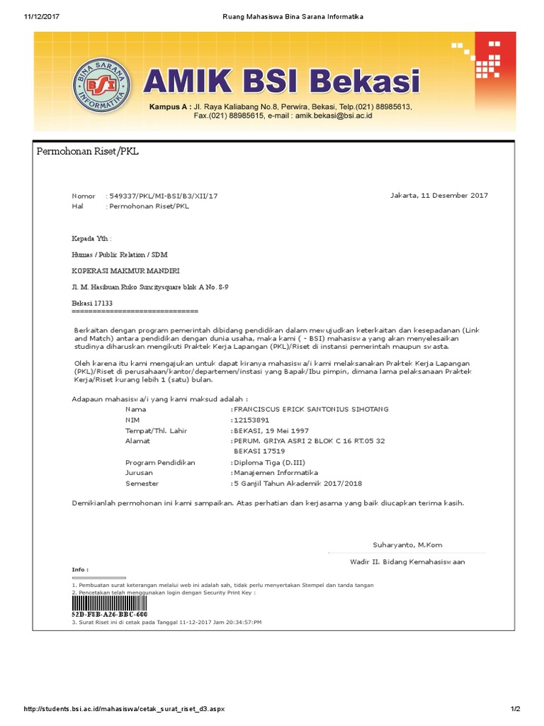 Situs ini dikhususkan bagi mahasiswamahasiswi akademi akademi bina sarana informatika dalam memperoleh informasi akademik nilai pembayaran biaya kuliah pendaftaran ujian her ta dll. Yah mungkin ada yang kurang paham cara untuk membuat surat riset secara online di bsi oklangsung aja ikutin caranya sbb. Academiaedu is a platform for academics to share research papers. Di dalam surat riset harus terdapat nama perusahaan lembaga yang dituju nama mahasiswa yang akan melakukan riset serta berapa lama masa riset akan dilakukan. Cek nim barusurat keluarsurat do. Kami memutuskan untuk melakukan riset konsumen untuk mengetahui preferensi mereka terhadap lobster air tawar.