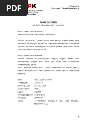 Home surat pernyataan contoh surat dakwaan tunggal berbagai kasus contoh surat dakwaan tunggal berbagai kasus surat dakwaan tunggal adalah surat yang menyatakan atau menerangkan hanya satu tindak pidana saja yang didakwakan karena tidak terdapat kemungkinan untuk mengajukan alternatif atau dakwaan pengganti lainnya. Surat tuntutan pidana reg. No reg perkara. Materi kuliah kemahiran hukum acara pidana by bos7wrd7waridi. Menjatuhkan pidana terhadap terdakwa panjul bin julan dengan pidana penjara selama 10 tahun. Majelis hakim yang kami terhormat sdr.