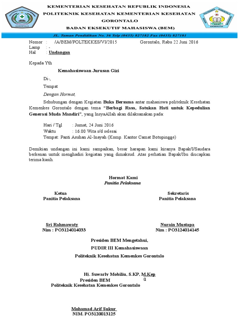 Contoh surat undangan bukber. Surat undangan dibuat banyak tidak hanya untuk satu orang dan penandatangan surat biasanya pake cap agar lebih menghemat waktu. Panitia persami gerakan pramuka gugus depan 13001 13002 sma negeri 1 sukosari sekretariat. Demikian beberapa contoh surat undangan buka puasa bersama baik via surat resmi atau wa. Contoh surat undangan surat undangan merupakan surat yang memberitahukan mengajak suatu permintaan atau permohonan kepada pihak lain untuk datang menghadiri acara atau kegiatan yang dilakukan oleh si pengirim surat. Contoh surat undangan buka puasa bersama sebentar lagi akan memasuki bulan suci ramadhan bulan penuh ampunan dan rahmat yang selalu ditunggu tunggu kehadirannya bagi setiap muslimin. Jlnraya kawah ijen sukosari 68287 telp 0332 321756 sukosari 28 april 2015 no.