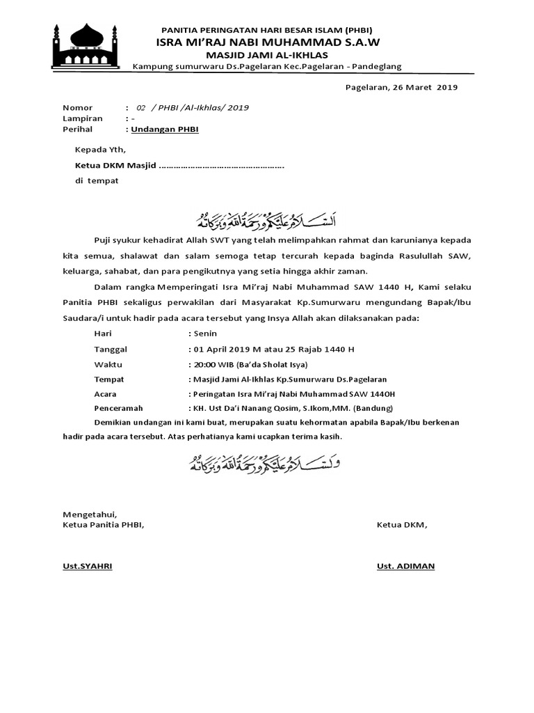 Contoh surat undangan isra miraj. Pada kesempatan kali ini kosngosan akan memberikan sampelnya sekaligus menjelaskan bagaimana cara menulis undangan formal acara isra miraj yang baik dan benar. Home undangan isra miraj contoh surat undangan pengajian isra miraj desember 31 2017 undangan isra miraj edit peringatan isra miraj sangat antusias disambut oleh umat muslim dengan mengadakan berbagai kegiatan keagamaan islami seperti pengajian umum pengajian akbar dalam rangka peringatan isra miraj yang diselenggarakan di masjid mushola maupun sekolah. Anda di halaman 1 dari 16. Cari di dalam dokumen. Sebagaimana adat di indonesia setiap kali mengadakan sebuah acara atau kegiatan tentu perlu menggunakan undangan.
