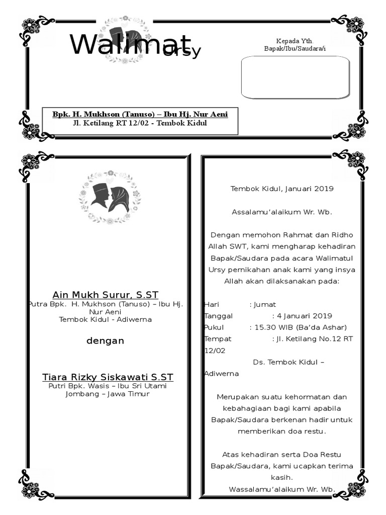 Contoh surat undangan walimatul ursy. Undangan walimah walimatul ursy buat kamu yang butuh contoh atau kamu bisa gunakan file docnya word 2007 kamu edit lalu print. Maka dari itu kami. Download contoh undangan pernikahan walimatul ursy dengan format. Tahlilan adalah salah satu bentuk kolaborasi budaya dan agama. Informasi undangan yang kami bagikan semoga menjadi informasi terbaik dan bisa benrmanfaat untuk semua khususnya informasi tentang contoh undangan walimatul ursy pdf terbaru 2020 yang semuanya kami kumpulkan dengan serapih mungkin. Bila membutuhkan template undangan pernikahan anda bisa mengunduhnya di sini.