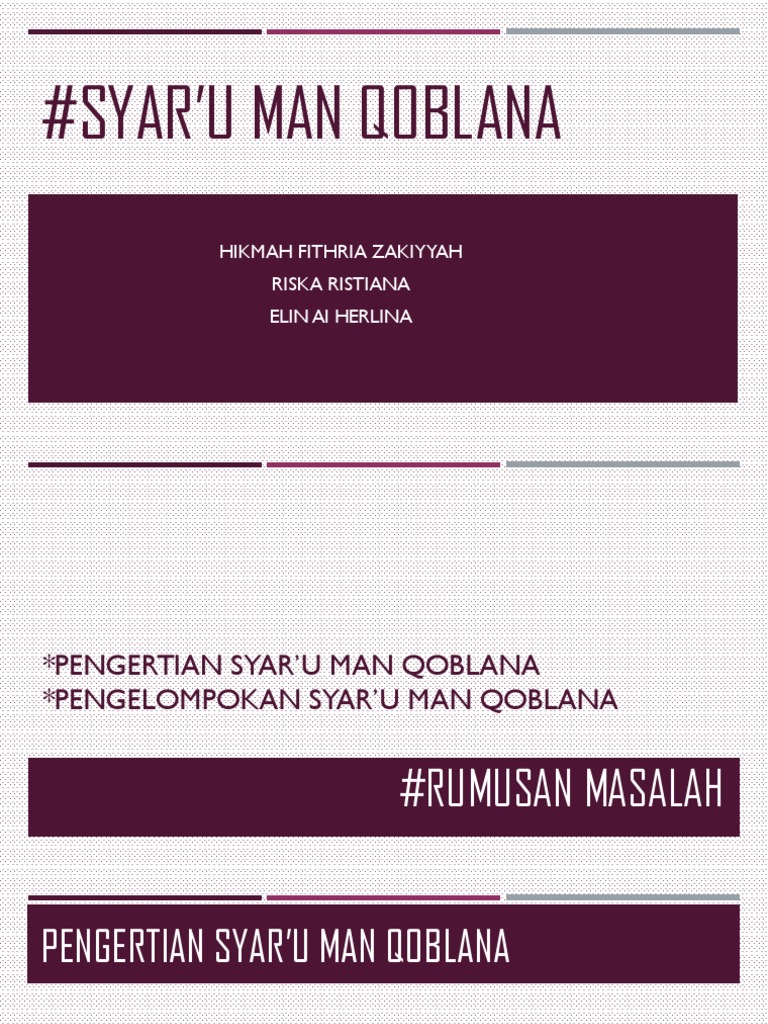 Pengertian syaru man qablana syar u man qablana ialah syari at yang diturunkan allah kepada umat sebelum kita yaitu ajaran agama sebelum datangnya ajaran agama islam seperti ajaran agama nabi musa isa ibrahim dan lain lain. Hal ini tercantum di dalam al quran surat al baqarah ayat 183. Syaru man qablana adalah syariat yang diberlakukan untuk kuam kaum terdahulu sebelum turunnya al quran sebagai syariat terakhir yang dapat digunakan hingga akhir zaman. Pembagian syaru man qablana dan contohnya. Rumusan masalah berdasarkan latar belakang di atas dapat diambil rumusan masalah sebagai berikut. Syaru man q ablana adalah syariat atau ajaran ajaran nabi nabi sebelum islam yang berhubungan dengan hukum seperti syariat nabi ibrahim nabi musa nabi isa as.