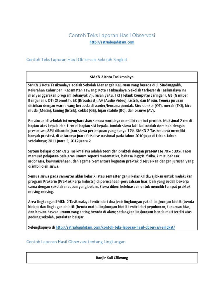 Singkat kata teks laporan hasil observasi adalah sebuah teks yang. Contoh teks laporan hasil observasi tahukah kalian observasi merupakan sebuah penelitian yang salah satu teknik dalam pengumpulan datanya digunakan dalam suatu penelitian tertentu. Adapun sub pembahasan mengenai teks laporan hasil observasi didalam belajar pendidikan bahasa indonesia ini telah sesuai dengan struktur dan kaidah yang. Dosenpendidikancom observasi adalah salah satu teknik dalam teknik pengumpulan data yang digunakan dalam suatu penelitian tertentu.