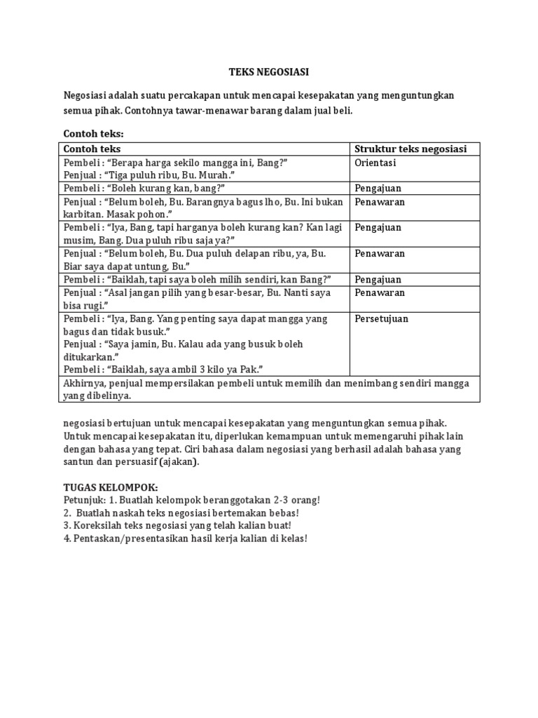 Negosiasi dapat terjadi di berbagai hal. Berikut beberapa contoh teks negosiasi pada artikel ini. Teks negosiasi jual beli ini meliputi jual beli di pasar jual beli buah buahan mangga jeruk apel rambutan dll baju tas sepatu dan lainnya. Contohnya adalah dalam jual beli lingkungan masyarakat lingkungan keluarga lingkungan sekolah dan masih banyak lagi. Nah disini yuksinauid akan memberikan contoh teks negosiasi dengan strukturnya. Kegiatan negosiasi tidak lepas dari kehidupan manusia sehari hari mulai dari negosiasi bisnis jual beli di sekolah lingkup masyarakat keluarga pengusaha dan pihak bank dan lainnya.