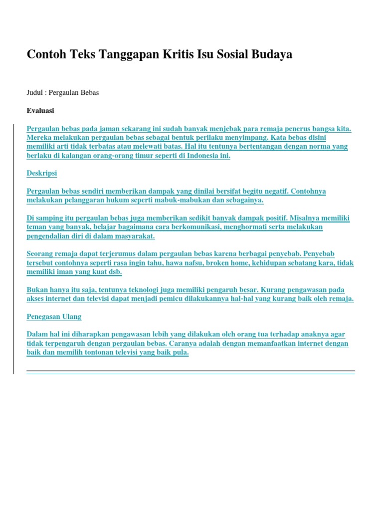 Tentu hampir semua orang pernah mengalami situasi di mana orang lain atau anda sendiri memberikan beberapa pertanyaan beserta respon atau tanggapan. Namun tentunya bebas di sini bukan berarti kita boleh mengemukakan pendapat seenak diri kita sendiri. Salah satunya adalah dengan menggunakan teks tanggapan kritis. Contoh teks tanggapan kritis tentang pergaulan bebas. Teks tanggapan kritis tentang pendidikan lingkungan sosial media dan fenomena alam merupakan beberapa contoh teks tanggapan yang umum kita jumpai dalam kehidupan sehari hari baik di lingkup sekolah maupun masyarakat. Kumpulan contoh teks tanggapan kritis singkat beserta strukturnya materi ini untuk melanjutkan pelajaran sebelumnya tentang pengertian struktur ciri kaidah teks tanggapan kritis.