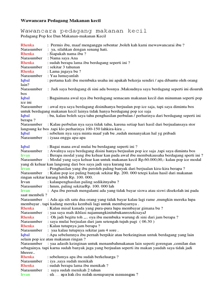 Contoh teks wawancara dengan pedagang. Tujuan dari wawancara yaitu untuk mendapatkan informasi yang tepat dan aktual dari narasumber yang tepercaya. Contoh teks wawancara anak sd dengan pedagang buah ibu pkk dan dokter gigi setiap kegiatan wawancara selalu bermanfaat untuk meningkatkan kemampuan berbicara dan daya analisis. Contoh wawancara dengan pedagang narasumber dari sebuah wawancara haruslah orang yang berkompeten dengan harapan informasi yang diberikan juga valid serta bisa dipercaya dan dipertanggungjawabkan. Darimana bapak terinspirasi untuk berdagang bakso. Contoh laporan wawancara dalam bentuk makalah. Teks wawancara adalah teks yang menggambarkan kegiatan percakapan reportasi yang dilakukan pewawancara dengan narasumber.