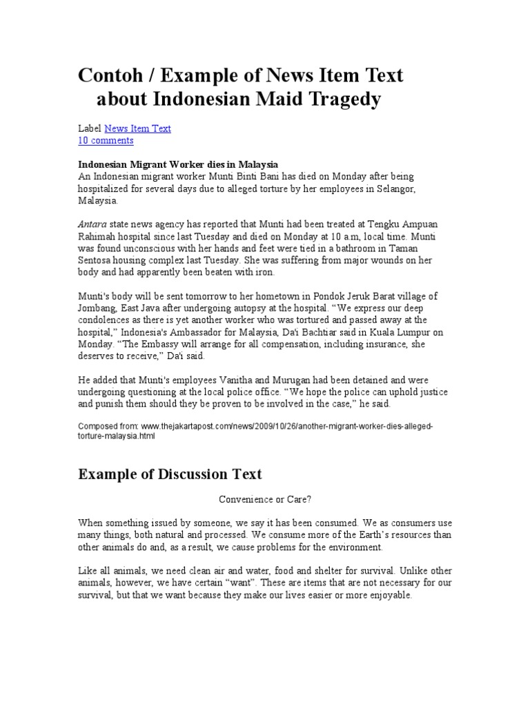 Hampir semua pasti sudah mafhum apa dan bagaiaman contoh news item text itu. Hal terpenting dalam teks ini ialah mencakup ketiga struktur di atas. Dalam contoh news item text tidak seharusnya menggunakan struktur news item text yang urut seperti di atas. Meski arti yang ditulis disni terkesan kaku dan sangat baku tetapi penterjemahan ini bersifat sebagai. Contoh news item text 2. News item text adalah salah satu jenis text yang menginformasikan pembaca tentang peristiwakejadian sehari hari yang layak diberitakan atau penting.