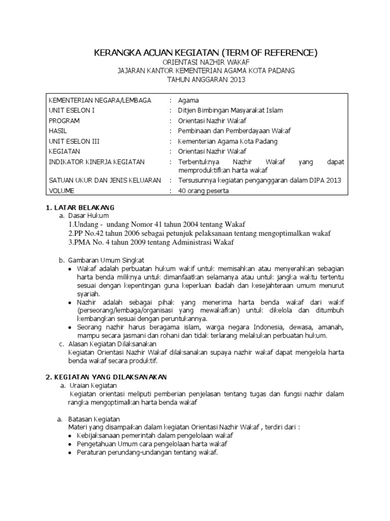 Contoh tor kegiatan pdf. Joko riswanto st karimun 24 juni 2013 2. Tata cara pembuatan torterm of reference tor kegiatan workshopsosialisasi diseminasiseminar penelitian dll tor pengadaan barang tor pembangunan gedung konstruksi oleh. Atas dasar pemikiran di atas maka diperulah sebuah panduan dalam penyusunan tor yang diharapkan menjadi rujuan setiap komponen universitas jember dalam menyusun usulan kegiatan atau tor. Demikianlah tor ini kami sampaikan dengan harapan bahwa kita dapat bekerjasama demi suksesnya acara ini. Terimakasih kepada pihak pihak yang membantu dan mensupport kami dengan usaha dan doa semoga allah swt berkenan melipahkan rahmat dan karunia nya pada kita semua. Implementasi kegiatan sesuai dengan peraturan perundangan yang berlaku.