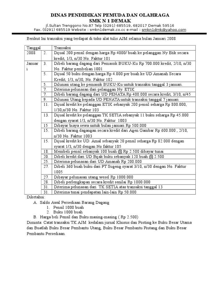 Contoh transaksi perusahaan dagang selama 1 bulan. Perusahaan dagang besar wholesaleryaitu perusahaan yang secara langsung membeli suatu produk dari pabrik dalam jumlah yang besarperusahaan kemudian menjual barangnya ke sebagian pedagang dengan sebuah perantara yang volume penjualan yang cukup besar. Jadi sampai tanggal 31 desember perusahaan itu masih harus menerima pendapatan bunga untuk 3 bulan oktober november dan desember yang harus diterima dengan begitu perlu dibuat penyesuaian. 62 contoh jurnal umum dan cara mudah membuatnya semakin anda sering berlatih dengan contoh contoh transaksi dan mengubah nya ke dalam jurnal khusus maka semakin mudah anda memahami materi tentang jurnal khusus ini. Siklus akuntansi perusahaan dagang jurnal barang penjualan akun pembelian buku bebanjasa dengan perusahaan dagang berikut ini disajikan contoh pencatatan transaksi perusahaan dagang yang telah berjalantransaksi transaksi yang terjadi selama bulan maret 2006 sebagai berikut. Berikut ini contoh transaksi yang terdapat di ud galunggung selama bulan januari 2008. Dari contoh neraca perusahaan dagang pt united tractors ini kita bisa melihat bahwa format dan elemen yang menyusun neraca keuangan terdiri dari akun akun.