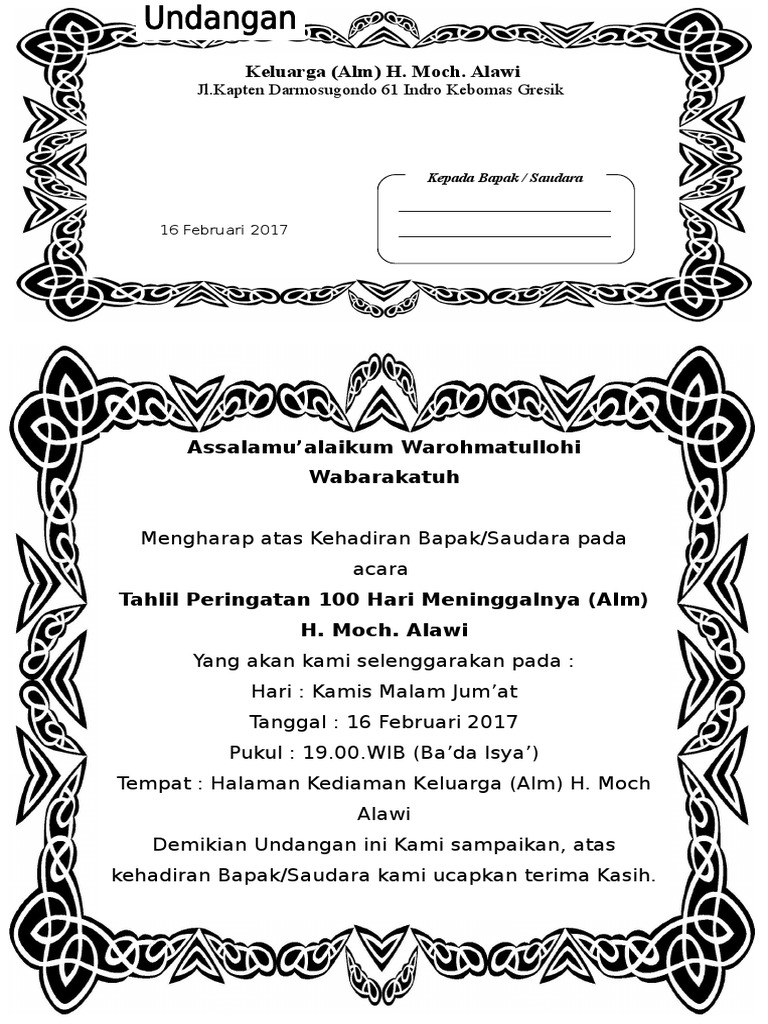 Word undangan tahlil lengkap docx baiklah setelah admin bahas panjang lebar mengenai asal usul tahlilan sekarang admin akan membahas bagaimana cara membuat undangan untuk tahlilan. Contoh undangan tahlil 7 hari 40 hari 100 hari dan 1000 hari tahlilan adalah kegiatan membaca kalimah kalimah toyyibah dan mendoakan orang meninggal secara berjamaah. Download undangan microsoft word berikut ini kami akan share beberapa contoh format atau file undangan dari berbagai macam acara seperti walimatul ursy walimatul khitan selapanan tahlil 40 hari 100 hari pendak 1 dan 2 seribu hari haul walimatul aqiqah karena sering kali kita kesulitan untuk mencari format atau contoh undangan seperti walimatul haji tingkepan acara rapat semuanya. Untuk nanti 30 30 mendukung tandai dokumen ini sebagai bermanfaat 10 10 menolak tandai dokumen ini sebagai tidak bermanfaat tanamkan. Contoh undangan tahlil tahlilan yasinan 100 hari yang baik dan benar assalamualaikum wrwb. Kami berbagi contoh surat undangan tahlil 40 100 1000 hari haul digunakan untuk acara tahlilan.
