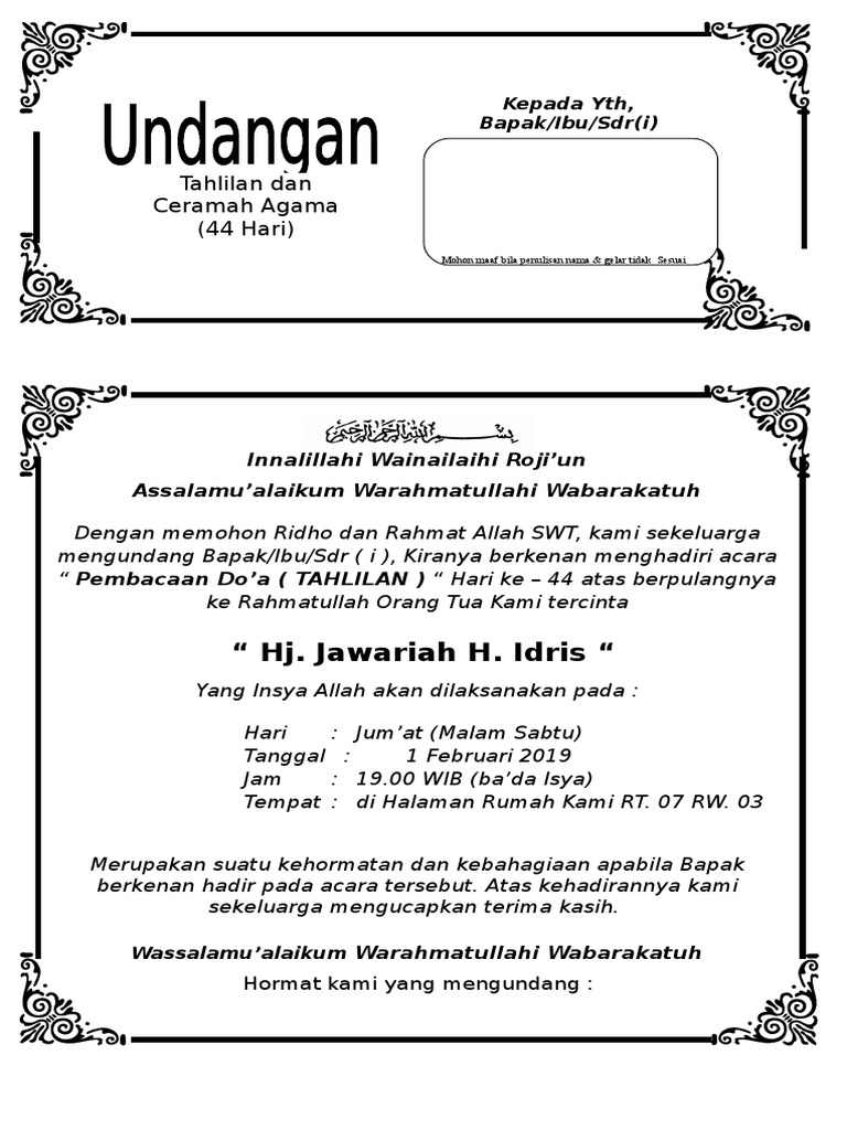 Contoh undangan tahlilan 40 hari. Tahlilan diadakan sebagai acara untuk memperingati hari kematian seseorang berdoa untuk seseorang dan juga refleksi bagi kita bahwa kita sangat dekat dengan nama kematian. Jadi tolong bantu kami dengan mengunggah 1 dokumen baru atau yang ingin kami unduh. 7 contoh surat undangan tahlil tahlilan 3 hari 40 hari 100 hari 1000 hari 1 tahun terlengkap surat undangan november 29 2019 0941 tahlil adalah salah satu tradisi yang sangat lekat di masyarakat muslim di indonesia. Kami berbagi contoh surat undangan tahlil 40 100 1000 hari haul digunakan untuk acara tahlilan. Yaitu acara mendoakan kerabat yang meninggal. Contoh undangan tahlilan 40 hari meninggalnya.