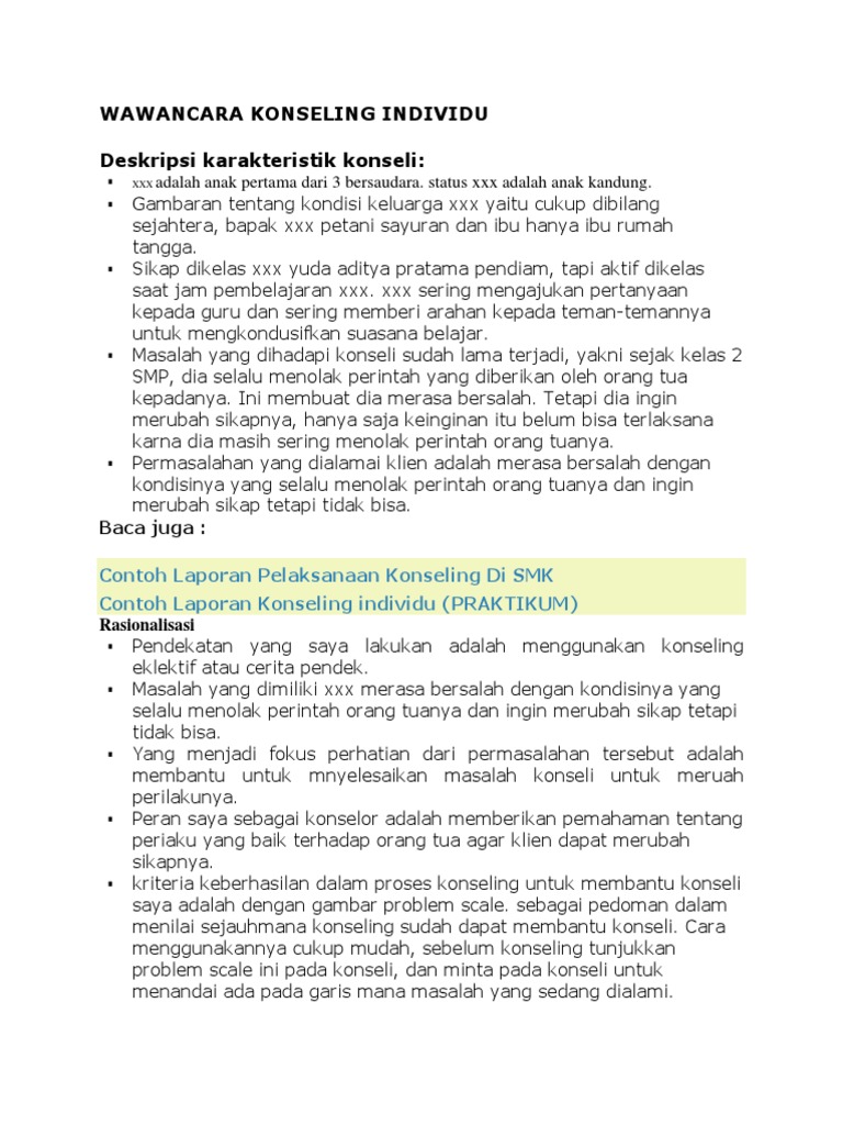 Contoh wawancara konseling individual lengkap. Yaitu klien diajak berfikir apakah perilaku yang terlambat dan menongkrong diterminal merupakan hal yang baik bagi pelajar. Contoh rpl 1 halaman bimbingan konseling pada bimb. Contoh wawancara bimbingan konseling individu terhadap seorang anak. Hanya ada mereka berdua yang melakukan kegiatan ini keperluannya dan kepentingannya dalam wawancara individual ialah untuk menggali informasi yang lebih dalam dan sifatnya tertutup. Silahkan baca artikel contoh verbatim konseling individu dengan menggunakan pendekatan trait and factor selengkapnya. Contoh dialog konseling individu gambaran singkat permasalahan konseli.